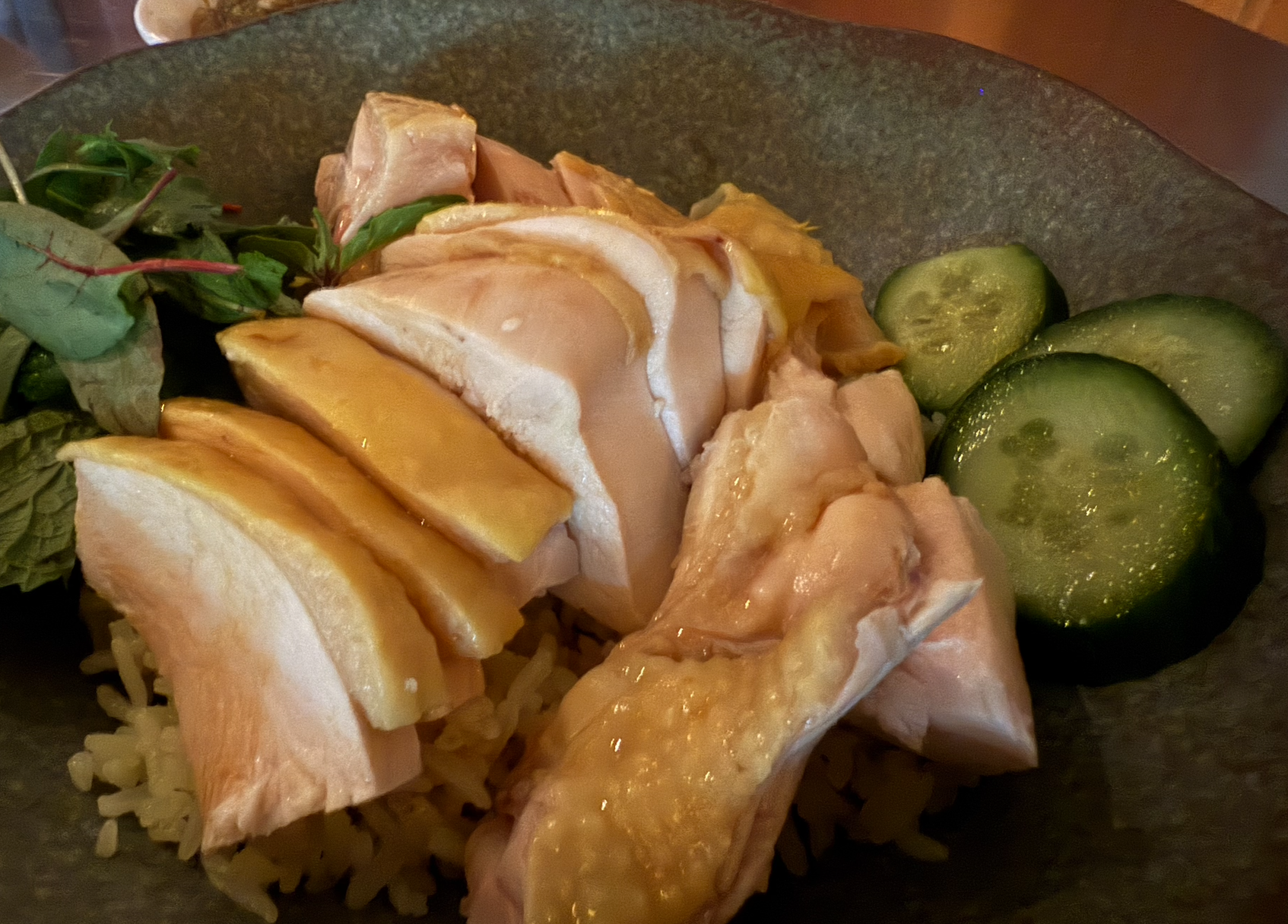 I'm not much of an expert in either Hainan Chicken Rice, nor Southeast Asian migration patterns, but I'll pretend to be both. I've been obsessed with Hainan chicken since my first visit to Singapore in 1998, and since have tried to consume as much of the dish as possible. Poached chicken, served atop fluffy white chicken flavored rice, and traditionally served with a spicy sambal, a garlic and ginger dipping sauce and dark, sweet soy sauce, all of which are intended to be customized and mixed to your own personal taste. I once spent an entire 48 hour trip eating at 12 different recommended Hainan Chicken places in Singapore off places I had cribbed from the Makan Guide and Lonely Planet's Thorntree (reddit, tik tok and youtube did not exist yet!) In Bangkok, I combed back alleys looking for the best khao man gai stalls. The simple meal of poached chicken over rice became my white whale.